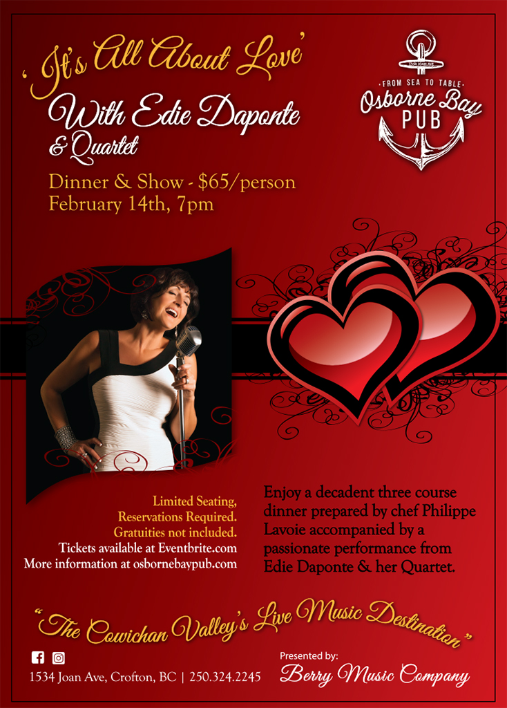 Experience an unforgettable evening with the beautiful Edie Daponte and her Quartet. Perfectly paired with a special 3 course dinner by chef Phillipe Lavoie. Edie brings passion, playfulness and an evident love of performance to her live shows.