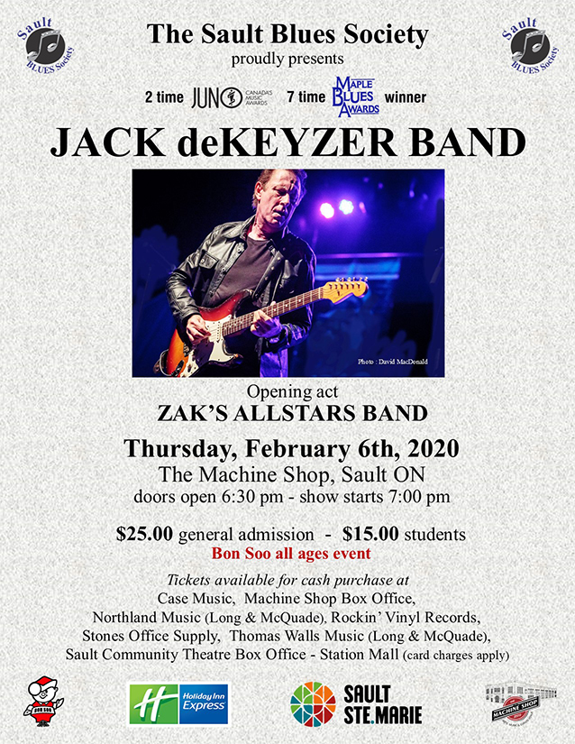 Join the the Sault Blues Society as they celebrate their 10th anniversary and their first concert of the year! The multiple award-winning Canadian bluesman Jack deKeyzer will take the stage on Thursday Feb. 6th 2020 at the Machine Shop.