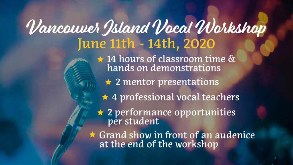 Welcome to the inaugural BC Vocalist Society Workshop! We are very excited for what this workshop will offer VI (and mainland!) vocalists. We've got an eclectic and dynamic program for many genres, jazz, blues, R&B, pop, country.....if you sing into a mic (or want to!), this workshop is for you.....details below: