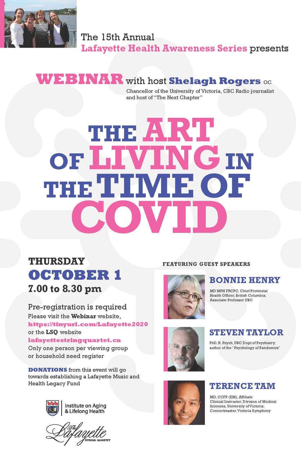 The 15th annual Lafayette Health Awareness Series will take place—as a webinar—on Oct. 1. Hosted by Chancellor Shelagh Rogers and featuring a performance by UVic’s Lafayette String Quartet, guest speakers include BC Chief Provincial Health Officer Bonnie Henry, UVic Medical Sciences instructor Terence Tam (concertmaster of the Victoria Symphony) and Steven Taylor, author of The Psychology of Pandemics.