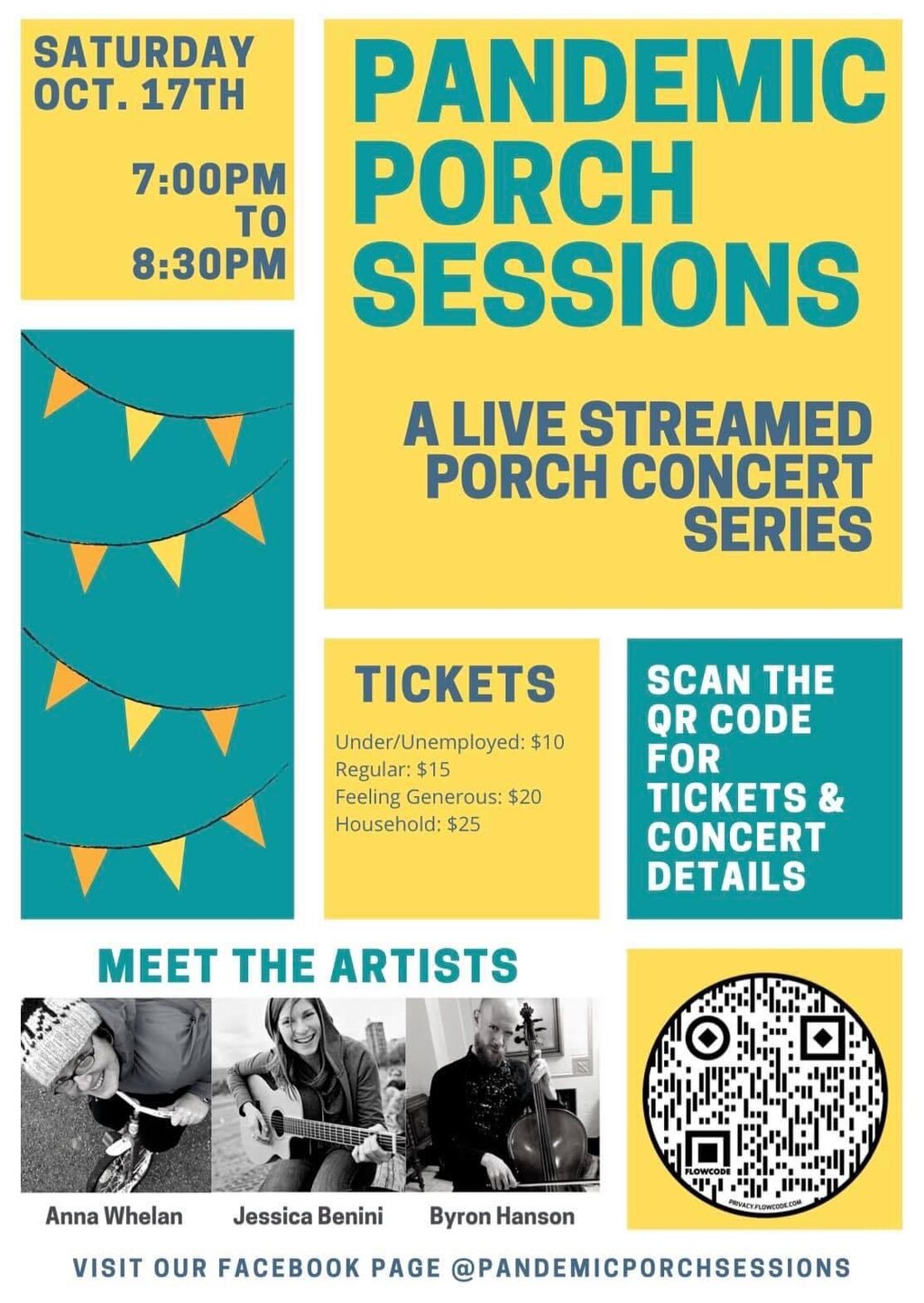 From my porch to your living room. Join Anna Whelan, Jessica Benini, and Byron Hanson for the first concert in the concert series Pandemic Porch Sessions: A live streamed porch concert series. We will share music, Stories, and general ramblings to make these COVID winter nights a little more cozy.