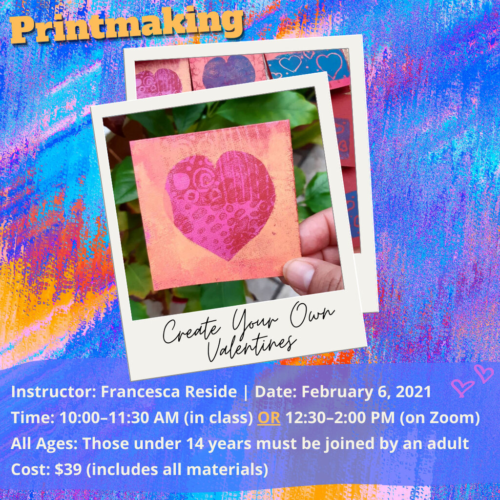 Have a heart, let's create art! Join us for a fun day of printmaking to celebrate Valentine's Day. Create your own cards, labels and more. Explore printmaking techniques you can recreate at home using everyday household items! Together, we will create one-of-a-kind, heartfelt valentines to help spread the love this month. Get ready to put your own stamp on Valentine's Day!