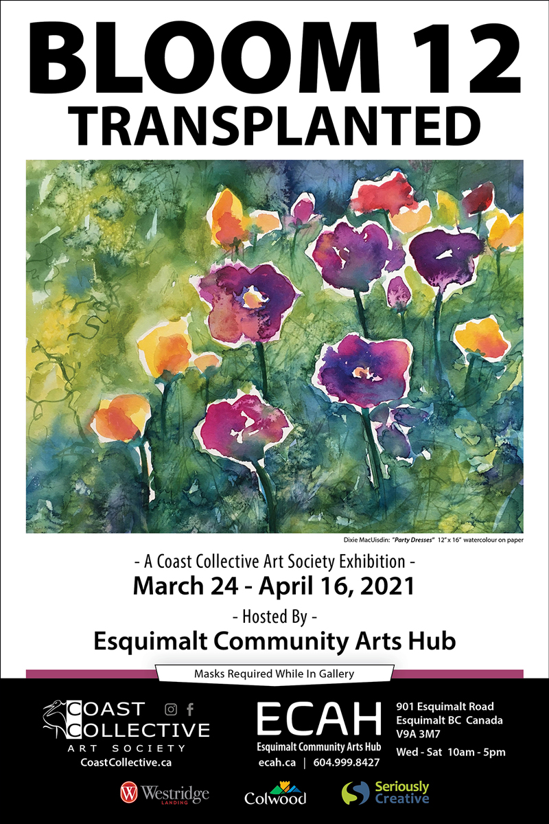 We are thrilled to announce that the Coast Collective’s most beloved and anticipated exhibition will be transplanted to the ECAH at 901 Esquimalt Road this spring! Bloom 12 Transplanted will showcase big, bold floral artwork created by Coast Collective Art Society members.
