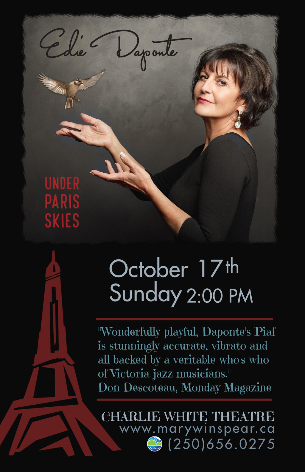 Joining Edie are long-time collaborator Joey Smith on bass, and Vancouver Island favourites, Jeff Poynter on piano, Aaron Watson on accordion and guitar and Jonathan Eng on percussion. Share the intimate theatre atmosphere and enjoy Edie’s soulful and captivating renditions of the music inspired by the city of love.