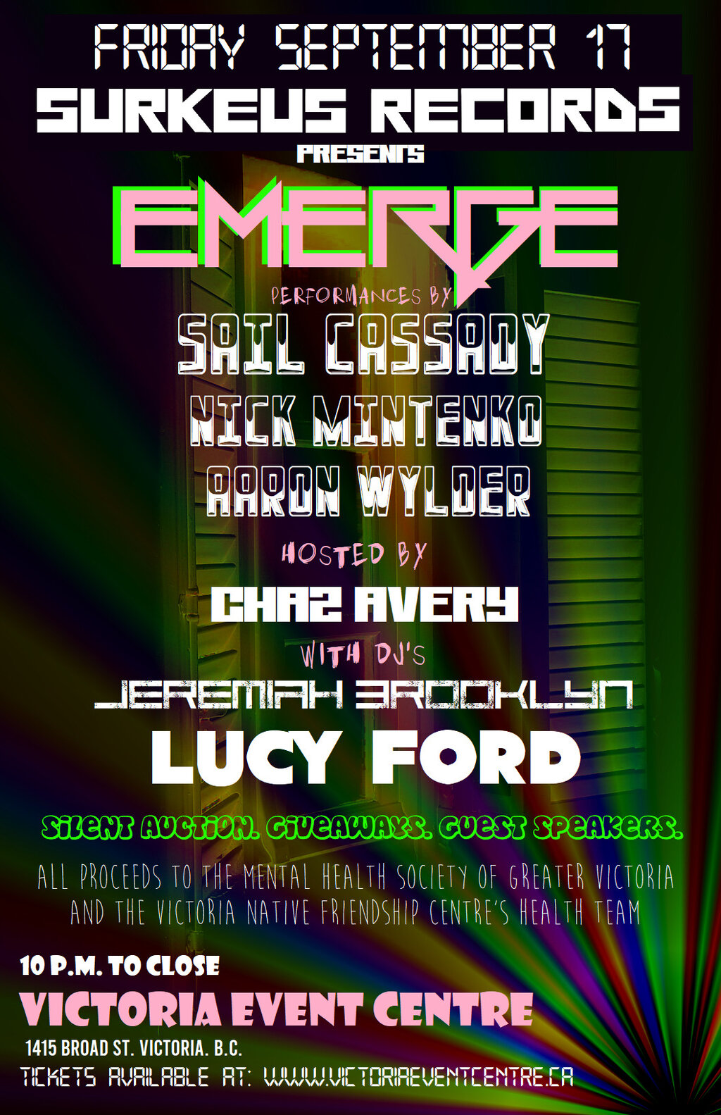 Join us at Victoria Event Centre on Friday September 17th for EMERGE, a night of music, magic, wonder and spectacle. With performances by: Sail Cassady, Nick Mintenko, Aaron Wylder. Chaz Avery will be hosting the event, and Dj’s jeremiah brooklyn and Lucy Ford will be spinning beats from our new electronic compilation to close the night out!