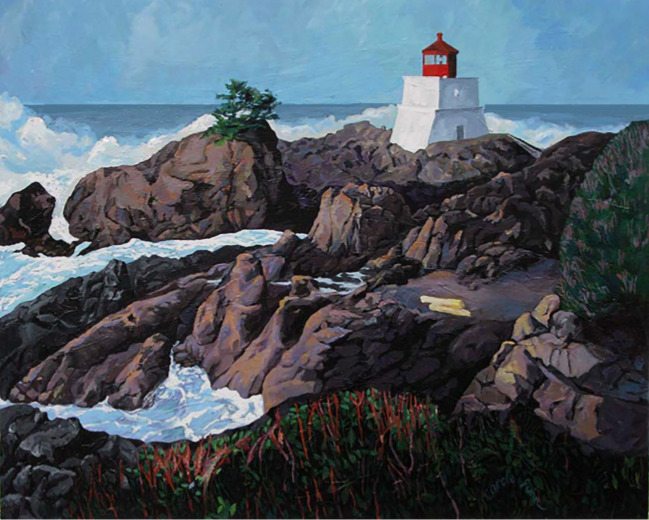 A visit to Ucluelet in 2009 started Carole Finn on her artistic journey as a professional artist. Like so many other painters, she was drawn in to put on canvas by the bold majesty of the rugged rock juxtaposed by the power and force of the ocean waters. “These first works were at the trailhead of the rest of my life” says Finn. The series that was produced from this trip to this part of Vancouver Island became a gallery show for the Agnes Jamieson Art Gallery of Minden Ontario Canada. The paintings, then, came back to Blackrock to be shown about the same time as the 2021 show but 12 years later . As if the fates are playing tricks, the same 2009 CEO, Adele Larkin, has returned to manage Blackrock and be on hand for this second show. Much has changed by now in Finn’s professional and personal life. She has now been awarded an SFCA by the Federation of Canadian Artists which is a status given “in recognition of Extraordinary achievement in the field of Visual Fine Arts”. In addition, she is an elected member of the Ontario Society of Artists which is one of the oldest art associations in Canada. The OSA is responsible for the founding of the Ontario Art College, as it was known and the Art Gallery of Ontario. Both groups can claim having one or more of the Group of Seven as one of its members. Until recently, Finn had a gallery and studio in Haliburton County, Ontario. There she held exhibitions of her own work as well as works of her students and other arts groups in the County. Never one to let her life become boring, Finn took a giant step and moved to Oak Bay, Victoria, Vancouver Island, British Columbia. Amid Covid isolation she set up a new studio and prepared to make her way into a new and unknown art world. This exhibition is one of those first steps. The works you will see will delight your senses. You will feel the dampness and fog in the air as the sun sets over the trees and the waves of the incoming tide lap over rocks draped with kelp. A trip down one of the trails will be a new adventure as you look at the forest canopy of branches above and remember the work that made you aware of the intricacies of their patterns. You will be looking for the blue in the paths and pink in trees . Finn photo-documents an area with many, many pictures. Then in the quietness of her studio she uploads her pictures and carefully chooses her painting reference material, that to her, best represent the uniqueness of the area. When you see the show you will be asking “Has she chosen well?” The answer will be your response to the show.