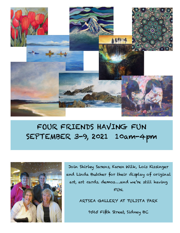 Four Friends Having Fun! Back for the fifth year… Lois Kissinger, Karen Wilk, Linda Butcher and Shirley Sarens will be painting, laughing, and visiting with guests at their annual art show. Enjoy their paintings, art cards and painting demonstrations from Sept 3 to 9, 2021 (10am -4 pm daily) at ArtSea Gallery in Tulista Park, 9565 Fifth St, Sidney BC.