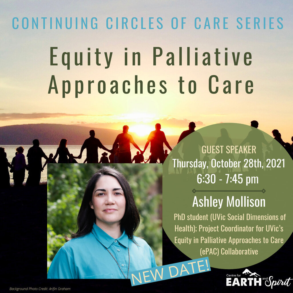 Online monthly circles for people tending End-of-Life questions. What services, programs and tools currently exist in the Victoria area for people facing end of life while also facing inequities? Join Ashley Mollison, Project Coordinator for UVic’s Equity in Palliative Approaches to Care (ePAC), as she gives us an overview on this collaborative which assists people facing end-of-life who simultaneously face inequities such as homelessness, poverty, isolation, racism and stigma. There will be lots of opportunities for discussion, so please bring your questions.