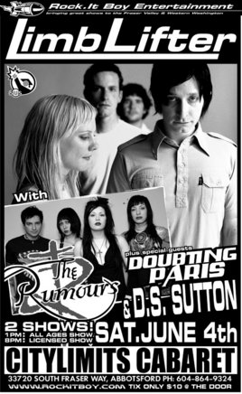 Rock.It Boy Entertainment presents LIMBLIFTER plus THE RUMOURS and special guests DOUBTING PARIS and DS SUTTON twice in a row on Saturday, June 4th at the City Limits Cabaret, 33720 South Fraser Way in Abbotsford (phone 604-864-9324). The All Ages Sow is a 1 p.m. and the fully licensed evening show is at 8 p.m. Tickets are $10.00 at the door