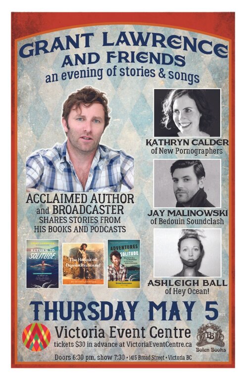 The Victoria Event Centre is proud to present Grant Lawrence and Friends: Return to Solitudes Stories and Songs. Celebrating the release of Grant's latest book "Return To Solitude", follow-up to his bestselling debut "Adventures in Solitude", Grant will treat the audience to an evening filled with hilarious and harrowing stories about our outlandish coastal characters. The true tales will be complimented by songs from three excellent Victoria-based musicians; Kathryn Calder (New Pornographers), Jay Malinowski (Bedouin Soundclash) and Ashleigh Ball (Hey Ocean). Join the acclaimed author, broadcaster, and raconteur-extraordinaire for an unforgettable night of stories and songs that are sure to have the audience laughing and singing along, feeling fully entertained.