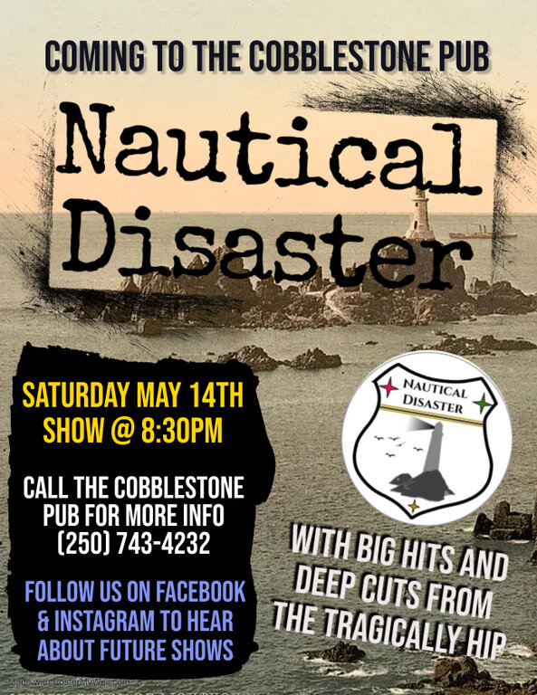 Come by the Cobblestone Pub if you're looking for a place to happen on May 14th. Its no Elvis-at-the-speedway kinda thing, but all the drinks are on the crown so come on down. Nautical Disaster is taking the stage with a 3-set show of big hits & deep cuts from The Tragically Hip. So muster some courage, twist some arms, and bring a highway girl; it's gonna be a good time!