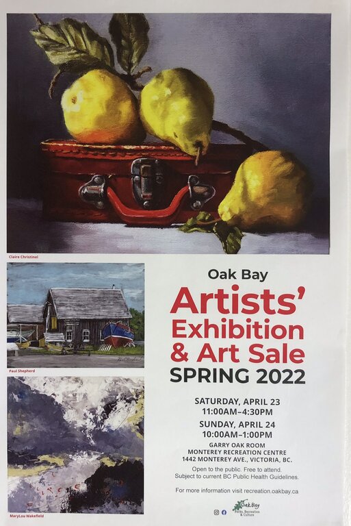 For the pasr 22 years, Oak Bay hosted the semi-annual Artists’ Studio Tour, with local artists opening their homes and studios to the public to view art. This Sprin, once again the event is being modified so that all public health orders can be followed to create the safest art exhibition possible. Local artists will be setting up temporary displays in the Garry Oak Room at the Monterey Recreation Centre for an Artists, Exhibition and Art Sale. Admission is free and open to the public.