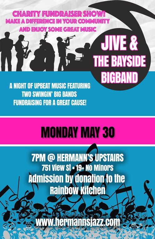 The Jive big band (directed by Nick La Riviere) and the Bayside Big Band team up for a night of great music for a great cause. Featuring everything from classic big band swing to Tower Of Power, it’s a show with a lot of variety. Donations made at the door go to Rainbow Kitchen, a a family-friendly community kitchen that specializes in providing delicious meals and connecting the community to resources.