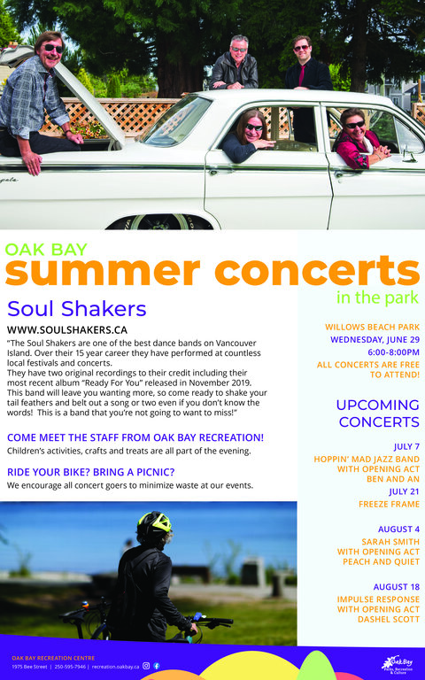 With a stunning backdrop of Willows Beach, these outdoor concerts gather the community to celebrate music and the arts. Our concerts highlight local musicians with emerging artists as opening acts. Presented by Oak Bay Parks, Recreation, and Culture.