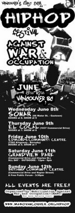 Hip Hop Festival Against War and Occupation: Main Offenders, Platino Latino Productions, Groundbreakers, Lady Sincere, Sunday School Dropoutz, Tapwater, PLUS: Breakdace crews @ Edmonds Community Centre (7282 Kingsway) Jun 10 2005 - Feb 6th @ Edmonds Community Centre (7282 Kingsway)
