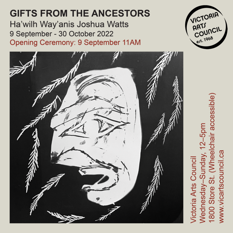 With funding through the BC Arts Council's IMPACT GRANT, the Victoria Arts Council is commissioning this work for exhibition, along with an artistbook created by Watts with his partner, Kwakwaka'wakw poet and activist Linnea Dick.