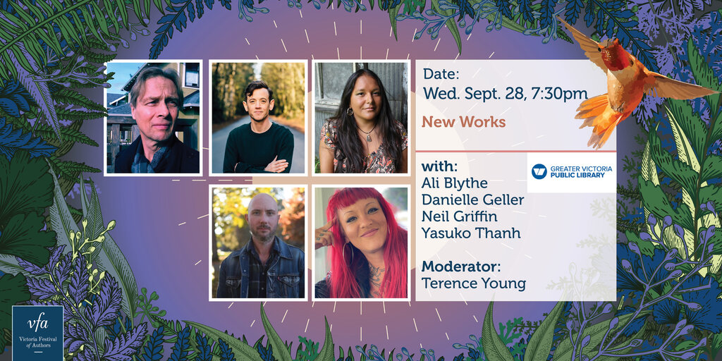 Southern Vancouver Island is home to an astonishing number of Canada’s writers, and it has been for many decades. The list of names reads like an introductory course to Canadian literature: Alice Munro, P.K. Page, Al Purdy, Dorothy Livesay, Phyllis Webb, and Patrick Lane, to name but a few of the early figures on the scene. Since their day, the syllabus has broadened and deepened in diversity. Tonight’s event shines a light on four recent additions to this roster—Ali Blythe, Danielle Geller, Neil Griffin, and Yasuko Thanh—whose explorations in poetry, memoir, fiction, and essays are earning them recognition and well-deserved praise in Canada’s writing world. They have agreed to join this evening’s panel to share excerpts of what they have been working on recently and to discuss their process, their sources of inspiration, and their challenges.