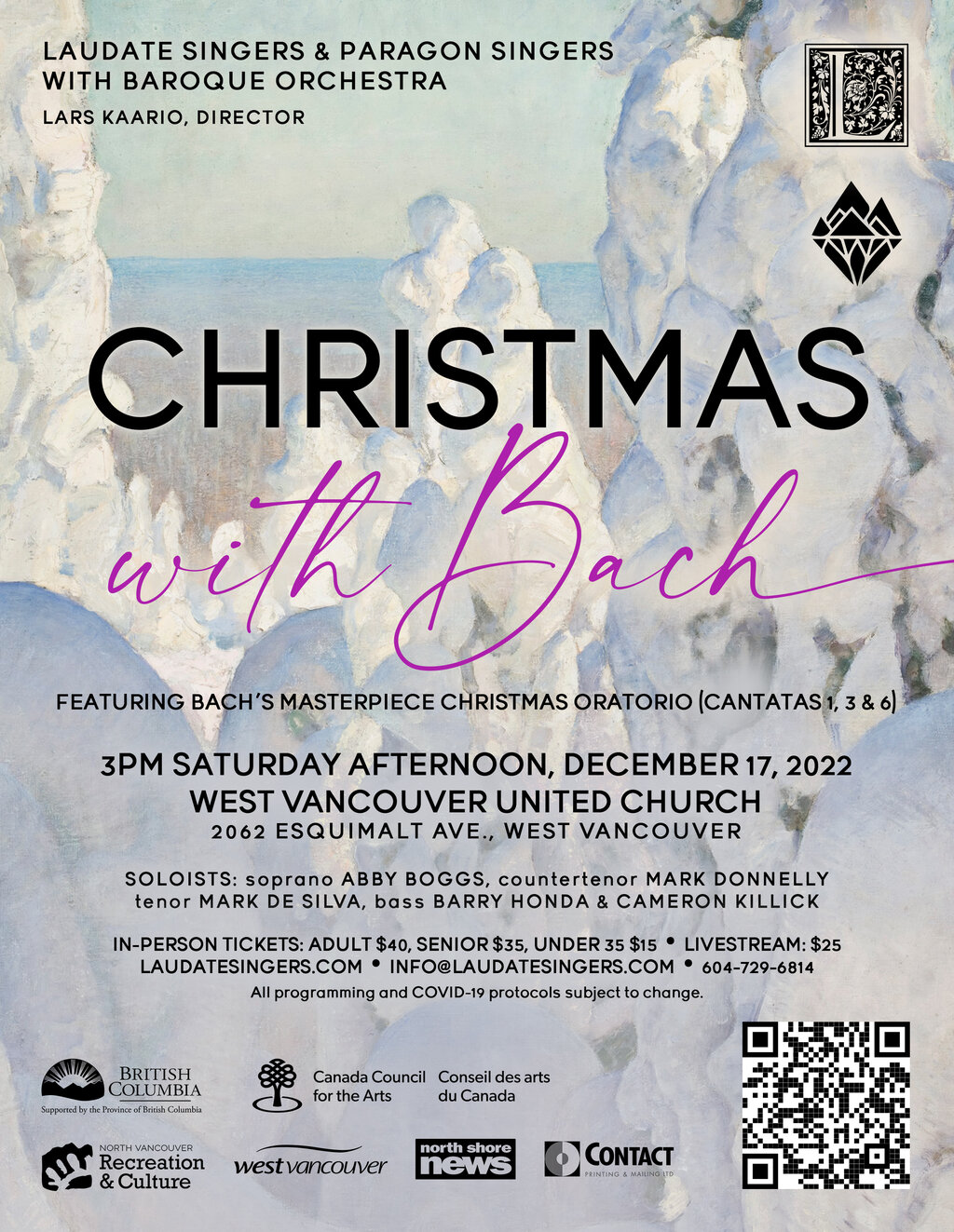 Herald the festive season with three cantatas from Bach's sublime Christmas Oratorio. The 75 voices of Laudate Singers, Paragon Singers, plus soloists and a 20-piece professional orchestra are thrilled to offer this glorious music on Saturday afternoon December 17th.