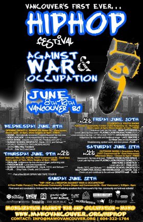 Part of the 2005 Hip Hop Festival Against War and Occupation: Threat From Outer Space, Spokes, Sketch Bros., EMOTIONZ, Genetics, Tapwater, Sunday School Dropoutz, Platino Latino Productions