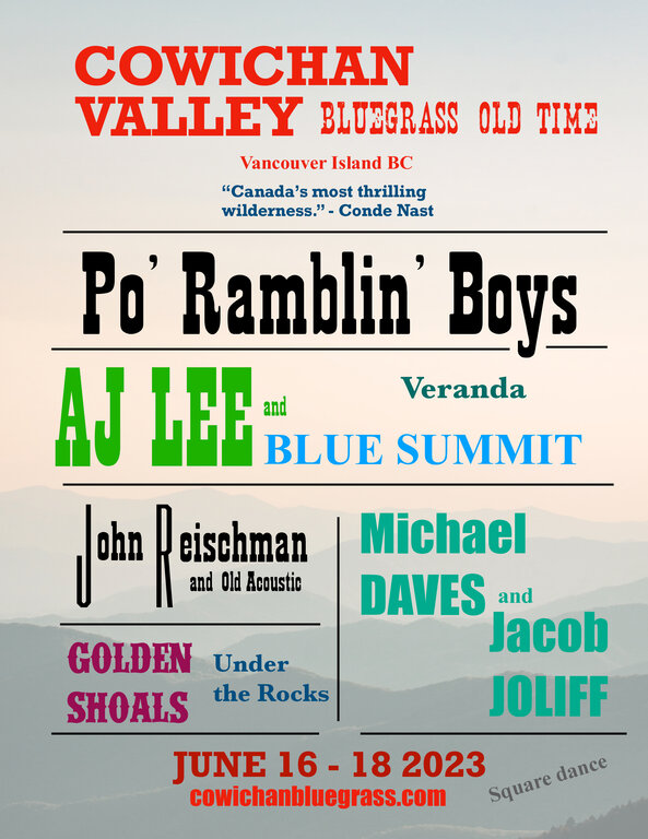BC's largest bluegrass and old-time music festival with multiple Juno and Grammy nominees The Po' Ramblin' Boys, Michael Daves, John Reischman, and California's hottest progressive bluegrass group AJ Lee and Blue Summit. Saturday night outdoor square dance with Golden Shoals, intimate performance workshops, non-stop jamming, and food and craft vendors galore.