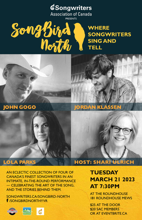 An eclectic collection of four of Canada's finest songwriters in an intimate, in-the-round performance - celebrating the art of the song and the stories behind them. Songwriters.ca/songbird-north
