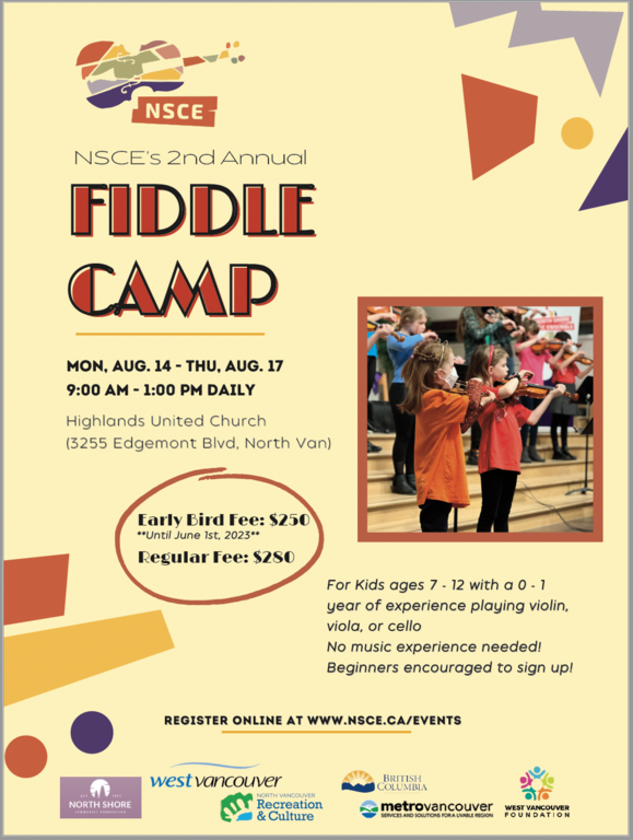 The second annual NSCE Fiddle Camp is a four-day camp for beginner violinists looking to explore the rich tradition of Celtic fiddle music in a fun, interactive, and creative way. Students will meet for four hours each day to learn, play, and build community together. At the end of the week, players will have an opportunity to perform what they have learned for their families.