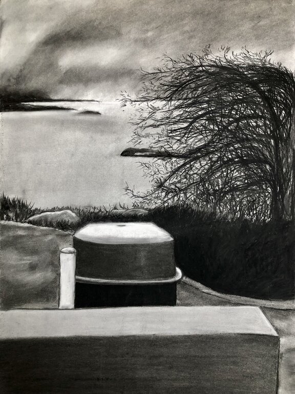 On her daily walks, Suzanne collects visual information about the ordinary landscapes of her everyday journeys. These “unremarkable” urban landscapes often include objects like power boxes, lamp posts and bike racks. “I am interested in how these constructed objects interact with the natural,” she says. “It appears to be an uneasy relationship.”