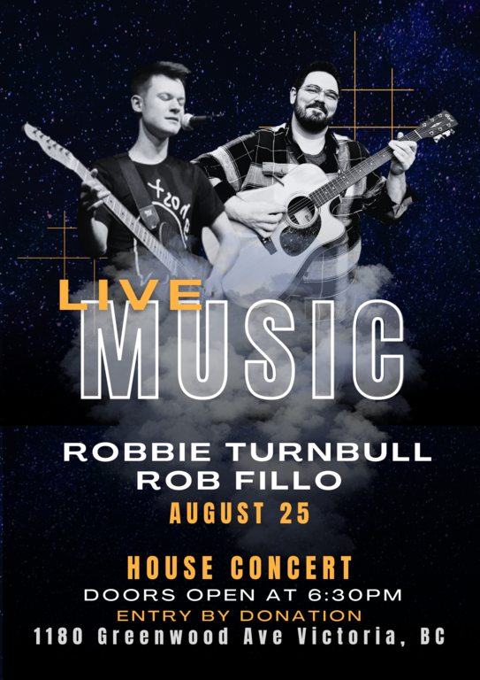 An intimate outdoor house concert featuring Robbie Turnbull and Rob Fillo. It's sure to be an amazing evening. Come out and join us!