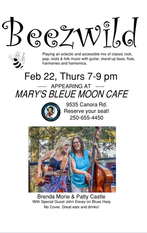 Eclectic mix of Classic Rock, Pop, and Roots Music featuring Brenda Morie on guitar, flute, harps and vocals, Patty Castle, upright bass. and vocals and special guest, John Davy, on blues harp. Everything from Ruthie Foster, Lucinda Williams, Everly Brothers, to Meg Trainor and the Good Lovelies, and Mississippi John Hurt.