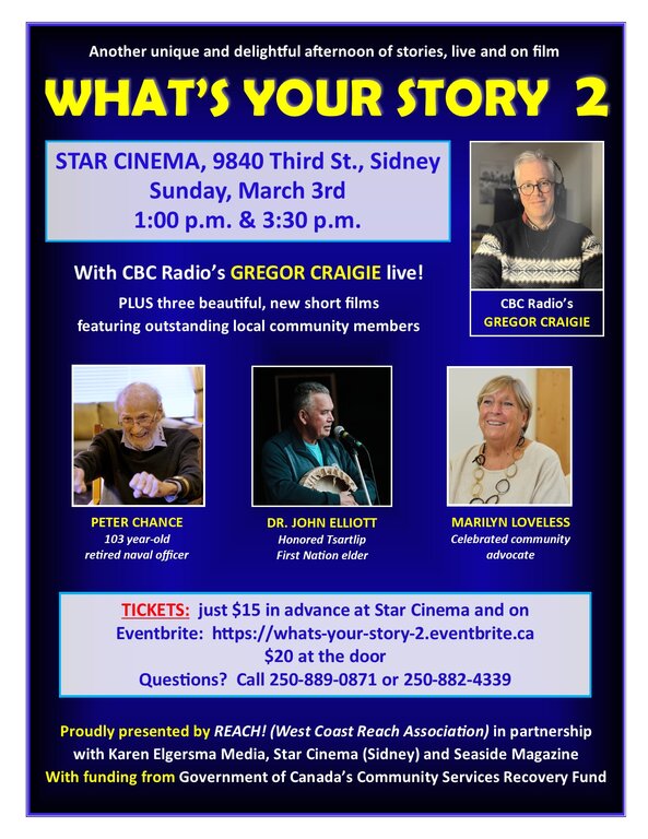 Featuring GREGOR CRAIGIE (CBC Radio Host and author) shares special stories in person from his experiences and books.  PLUS three beautiful short films are premiered featuring outstanding seniors/elders in the local community. - Including PETER CHANCE (103 year-old retired naval officer), DR. JOHN ELLIOTT (honored Tsartlip First Nation elder and teacher) and MARILYN LOVELESS (celebrated community advocate).  Prepare to be well entertained and truly inspired!   At STAR CINEMA in Sidney, Sunday, March 3rd, 1:00 p.m. and 3:30 p.m.  Advanced tickets just $15 in advance at Star Cinema and online at: https://whats-your-story-2.eventbrite.ca  $20 at the door.  Proceeds to benefit the charitable programs of West Coast REACH! Association: www.westcoastreach.org/