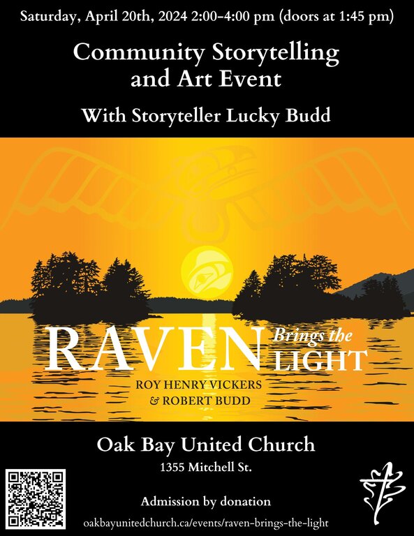 Please join us at Oak Bay United Church as we celebrate Earth Day 2024 through the telling of the Indigenous tale Raven Brings the Light. The story, which originated over 3,000 years ago, is a traditional story of the peoples of the Northwest Coast of BC. It will be recounted by Robert (Lucky) Budd, a gifted oral storyteller, who collaborates with renowned Indigenous artist Roy Henry Vickers to preserve traditional stories and share them with people of all ages.