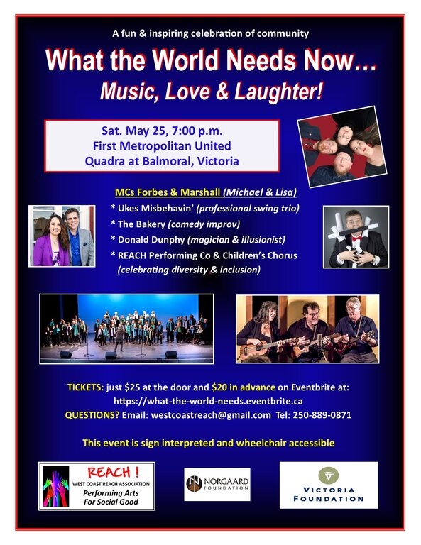 We think you'll love our upcoming show on May 25th - "WHAT THE WORLD NEEDS NOW - Music Love and Laughter!" featuring entertaining and inspiring performances by REACH groups and special guest performers.