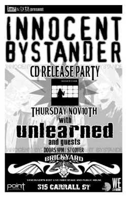 THIS THURSDAY, Nov 10th IMU & CiTR present INNOCENT BYSTANDER CD RELEASE PARTY with UNLEARNED & guests @ The BRICKYARD, 315 Carrall Street - (604) 685-3922, 9pm / $7 cover
