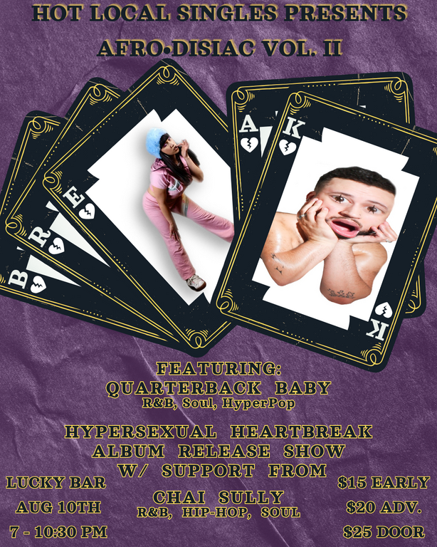 We’re back at Lucky Bar to celebrate one year of Hot Local Singles Presents bringing you live music events in Victoria. To celebrate one-year, we're bringing back the artist that it all started with—Quarterback Baby, with support from the divine Chai Sully! Quarterback Baby is returning to this sleepy ass lil’ town to throw it back harder than you thought was possible while dropping HIS DEBUT ALBUM Hypersexual Heartbreak (!!!). With Quarterback & Chai brining immaculate r&b and hip-hop bops to the stage, you'd be a fool to miss these divas.