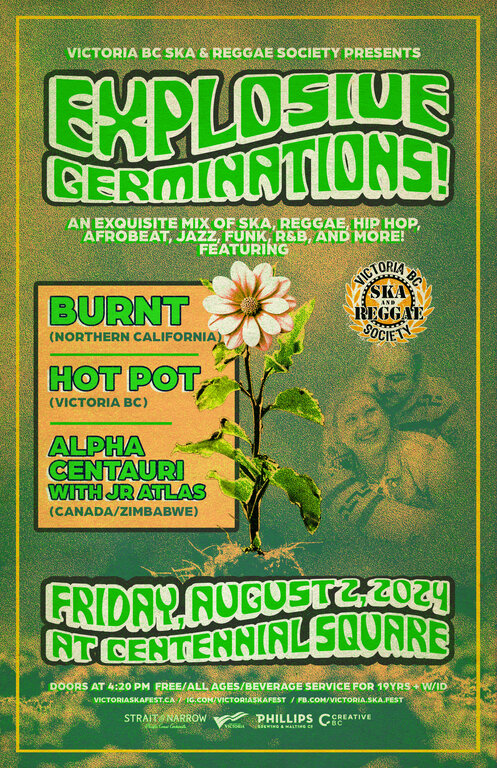 Mark your calendars for Friday, August 2nd at Centennial Square. Victoria Ska and Reggae Society is excited to present "Explosive Germinations" - an exquisite mix of ska, reggae, hip hop, Afrobeat, jazz, funk, R&B, and more featuring our good friends BURNT, Hot Pot, and Alpha Centauri with JR Atlas.