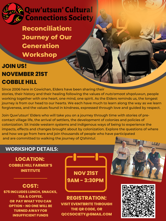Join Quw’utsun’ Elders who will take you on a journey through time with stories of pre-contact village life, the arrival of settlers, the development of colonies and policies of colonization. Sit inside western systems and indigenous ways of being, to experience the impacts, effects and changes brought about by colonization. Explore the questions of where and how we go from here and join thousands of people who have participated and are committed to walking the road of Q'shintul - walking this journey together.