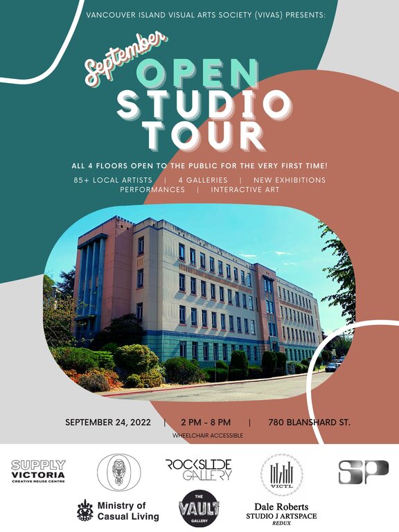 Join us for an open house at Victoria's largest arts hub! Artists will open their studio doors, and for the first time the ENTIRE building will be open to the public!! With 4 galleries, 4 arts and culture non-profits, and over 85 artists, there will be lots to see and do, including interactive and performance art, as well as the opening of Rockslide Gallery's highly anticipated portrait show titled "Visage".
