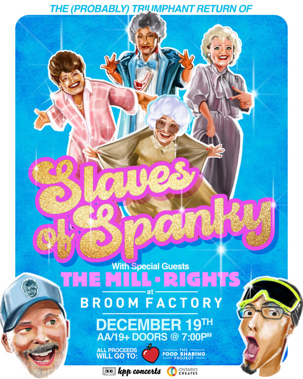 KPP Concerts presents SLAVES OF SPANKY live at the Broom Factory on December 19, with support from THE MILL RIGHTS. All proceeds from this performance will support The Food Sharing Project - a local organization that provides the food for in-school breakfast, lunch and hearty snack programs across Kingston, and throughout Frontenac and Lennox & Addington Counties.