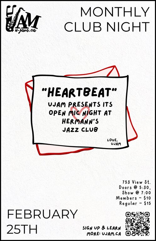 UJAM affords amateur singers and musicians a chance to perform backed by a quartet of pros. “HeartBeat” — explore its melodies, rhythms, love, friendship, family and connection or whatever heartbeat means to you. Sign up at https://www.u-jam.ca/info-monthly-club-nights or just show up to support a friend or enjoy the music.