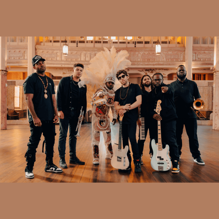 New Orleans’ GRAMMY-nominated supergroup The Rumble is more than just a band — it's an opportunity to be immersed in a wholly unique facet of New Orleans culture. Composed of Second Chief Joseph Boudreaux Jr. of the Golden Eagles, trumpeter Aurélien Barnes, trombonist José Maize Jr., bassist TJ Norris, guitarist Ari Teitel, keyboardist Andriu Yanovski, and drummer Trenton O’Neal, they fuse iconic New Orleans funk in the vein of The Meters and The Neville Brothers with electrifying brass and the singular visual splendor of the Black Masking carnival tradition. The Rumble's recent album, Stories from the Battlefield, received a GRAMMY nomination for “Best Regional Roots Album 2025.”  Their live show is a symphony of rich colour and propulsive sound, with each member sharing vocal duties and engaging the audience in the classic Mardi Gras Native-American-style call-and response chanting.