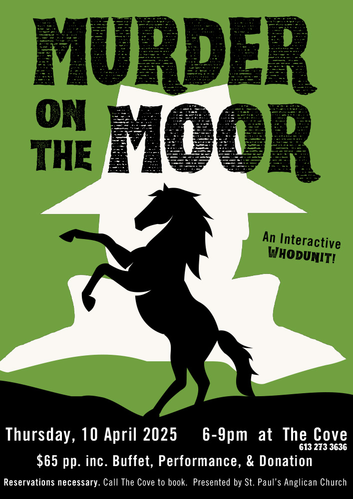The next Murder Mystery fundraiser is upon us! Join in on the fun and help support a worthy cause on Thursday April 10th, 2025 from 6-9pm at The Cove Inn. $65 per person includes a delicious Cove buffet, the performance and a donation to St. Paul’s Anglican Church.