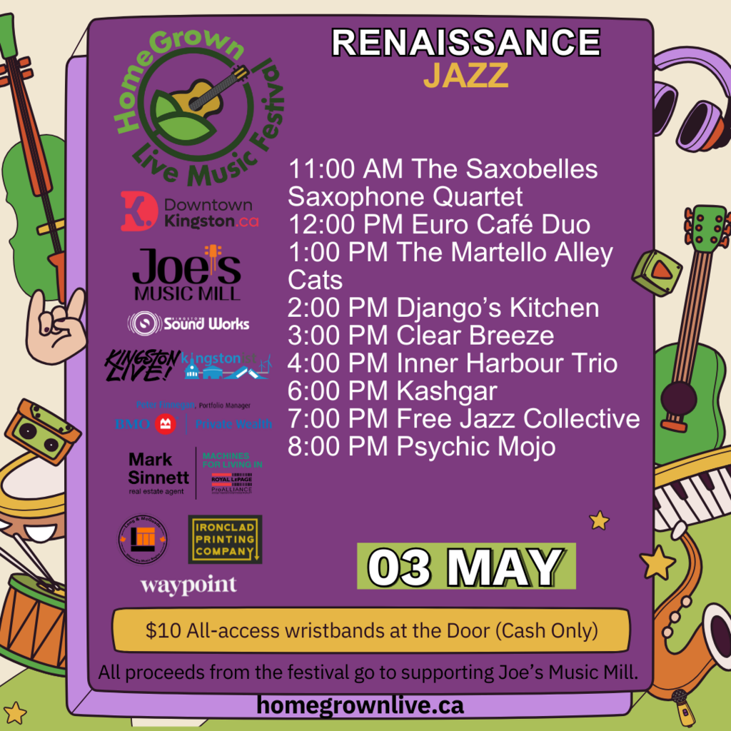 HomeGrown Live Music Festival 2025: The Saxobelles, Euro Café Duo, Martello Alley Cats, Django's Kitchen, Clear Breeze, Inner Harbour Trio, Kashgar, Free Jazz Collective, Psychic Mojo