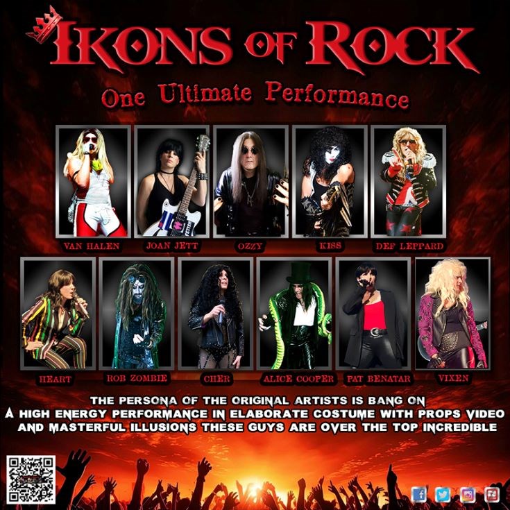 Ikons of Rock will be delivering hit after hit with their renowned Snake Oil performance which portrays such artists as; Kiss, Ozzy Osbourne, Alice Cooper, Def Leppard, Van Halen, Joan Jett, Vixen, Heart, Queen, Lita Ford, Pat Benatar, Autograph, Rob Zombie, Cher and more.