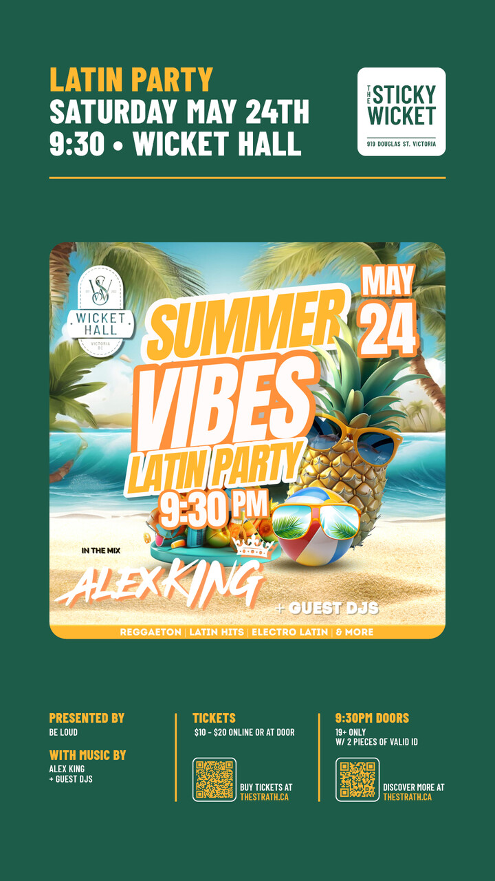 Get ready for an unforgettable night! This Saturday, May 24th, starting at 9:30 PM, the Wicket Hall at Sticky Wicket in Victoria, BC, will host the most anticipated Latin party: the “Summer Vibes Latin Party”.