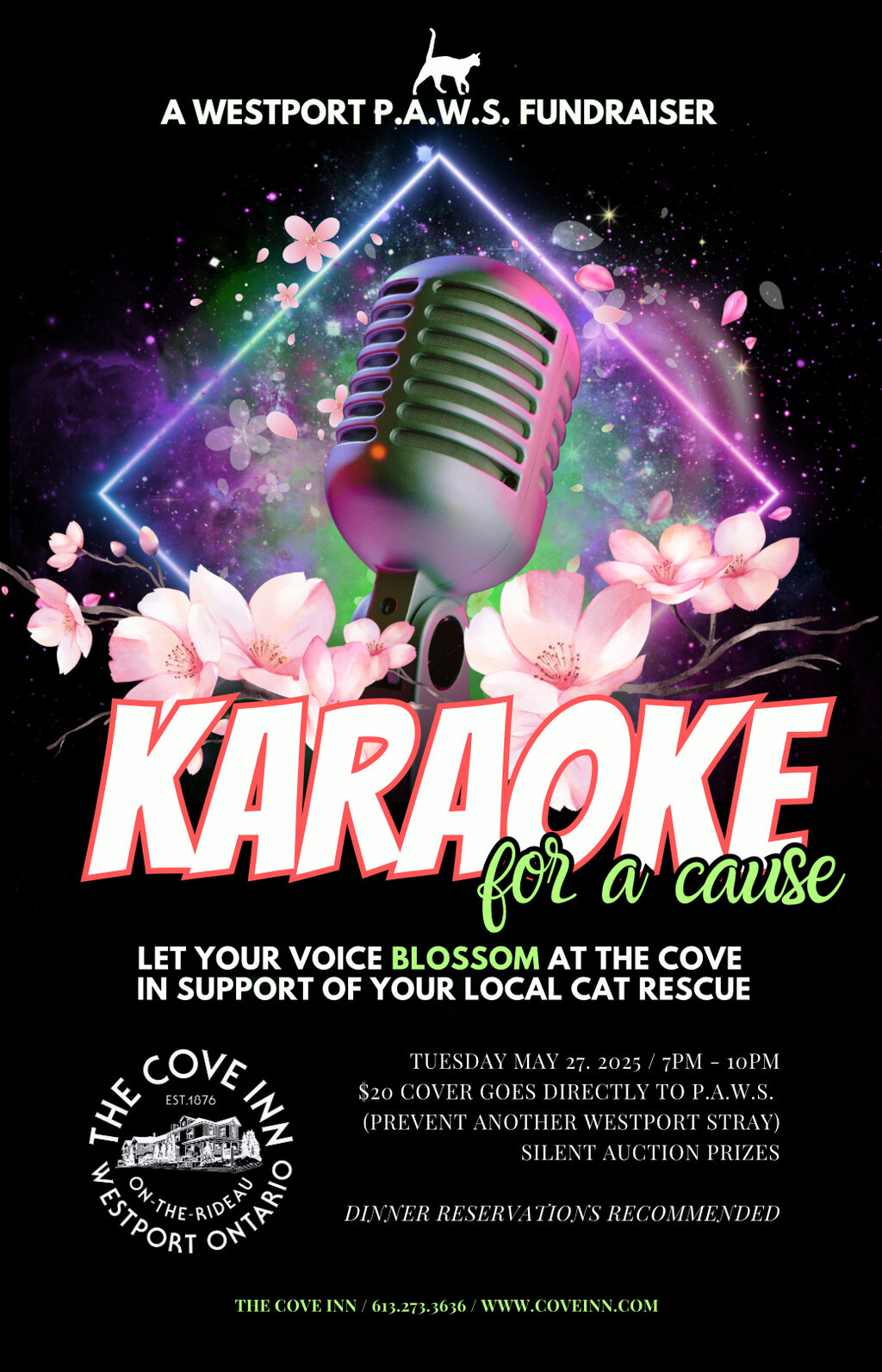 Come and sing karaoke to celebrate spring and help fundraiser for P.A.W.S., Prevent Another Westport Stray! 7-10pm at The Cove Inn. $20 admission and donation.