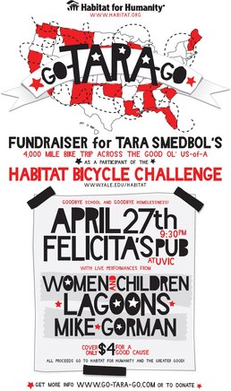 Help Tara Smedbol bike 4,000 miles across the continent with 90 other university students and enjoy battle of the band winners and SXSW participants Women & Children, newly reformed Lagoons and uberspielman Mike Gorman! Visit www.go-tara-go.com or www.yale.edu/habitat for more information on this undertaking.