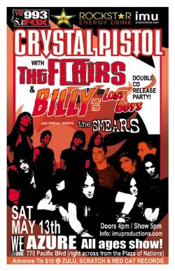 THIS SATURDAY! May 13th CFOX 99.3 FM, ROCKSTAR ENERGY DRINKS & IMU present Crystal Pistol w/ The Flairs and Billy + The Lost Boys Double CD Release Party & The Smears *ALL AGES SHOW* @ AZURE (770 Pacific Blvd, right across from the Plaza of Nations) . Early show: 4pm - 9pm . Info: 604-633-1611 . Cover $12 at the door / $10 advance tickets available at Zulu, Scratch & Red Cat Records and online at http://www.imuproductions.com/tickets