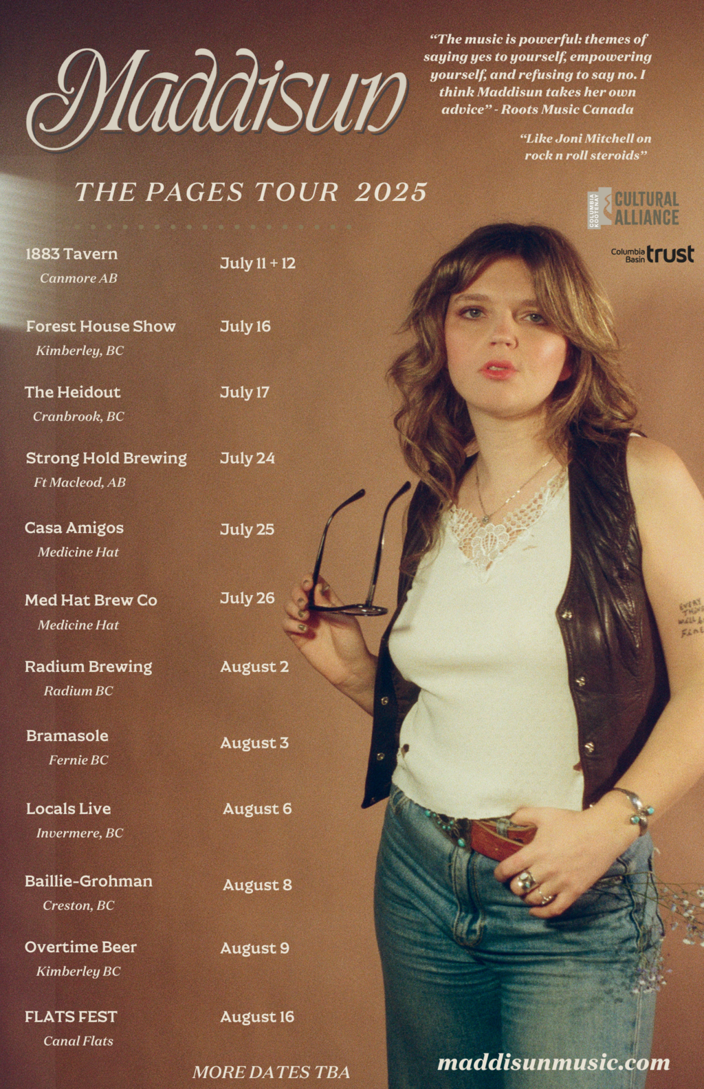 Cranbrook, BC’s own Maddisun hits the road for The Pages Tour—an exciting album release tour filled with heart, energy, and soul. Blending her original indie-folk rock songs with fun, familiar covers, Maddisun brings a vibrant mix of storytelling and feel-good vibes to every stage.