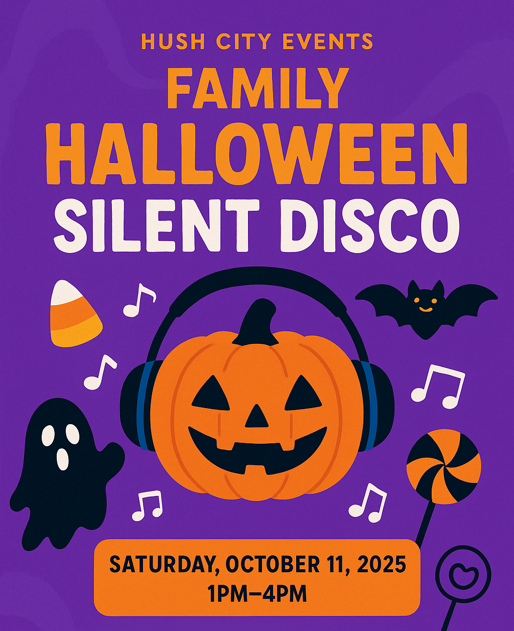 Hush City Events invites you to our family-friendly Silent Disco on Saturday, October 11th, 2025, from 1PM–4PM at the Quality Inn & Conference Centre Kingston Central.