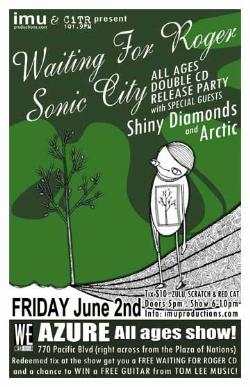 Friday, June 2nd IMU & CiTR 101.9FM present Waiting For Roger & Sonic City Double CD Release Party with guests The Shiny Diamonds & Arctic *ALL AGES SHOW* 5pm-10pm @ AZURE (770 Pacific Blvd, right across from the Plaza of Nations) . Doors $10 advance tickets available at Zulu, Scratch & Red Cat Records and online at http://www.imuproductions.com/tickets ~ Advance ticket purchases INCLUDE A FREE COPY of the NEW Waiting For Roger CD and a chance to win a FREE GUITAR from Tom Lee Music!
